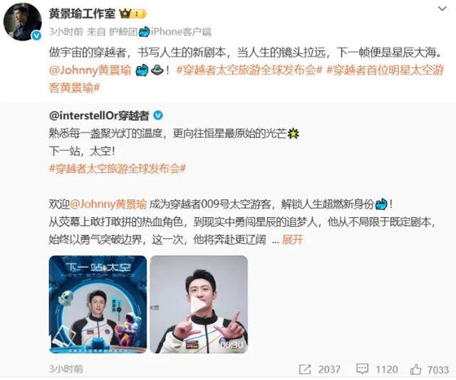 1月22日,@interstellOr穿越者 官宣@Johnny黄景瑜成为009号太空游客,黄景瑜在vcr中表示很荣幸成为一名太空旅客,将乘坐中国人自己的飞船亲身抵达那片星海。